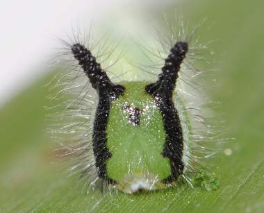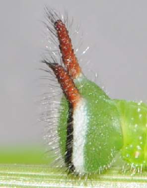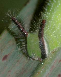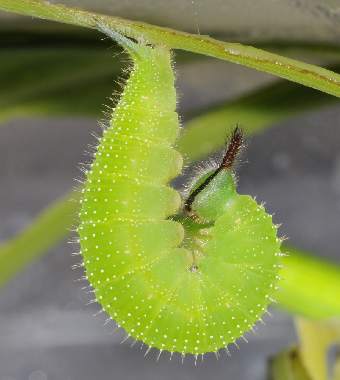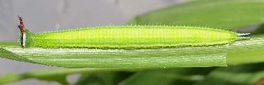 | ウスイロコノマチョウは、クロコノマチョウと同様に、温暖化に伴い勢力を拡げてきました。しかし、クロコノマチョウは大阪府全域から関東地方まで完全に土着したといってもよいでしょうが、ウスイロは、夏から秋にのみ稀に見られるだけのようです。私自身は大阪市はおろか、本州でもまだ成虫を見たことがありません。2011年11月に石垣島でたまたま採集して飼育羽化させた幼虫を見て、ずっと怪しいとは思いながらもクロコノマチョウだと思っていた、2005年8月に大阪府豊能町で見つけて飼育した幼虫が、ウスイロコノマチョウと判明しました。ここではそれらの、2回の飼育の様子を中心に紹介します。成虫では、クロとウスイロの違いがはっきりと分かりませんが、終齢幼虫では、頭部突起が茶色なのがウスイロ、黒色がクロとして明確に区別できるようです。 |