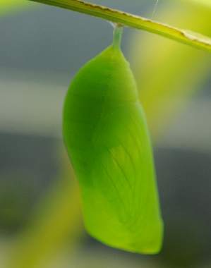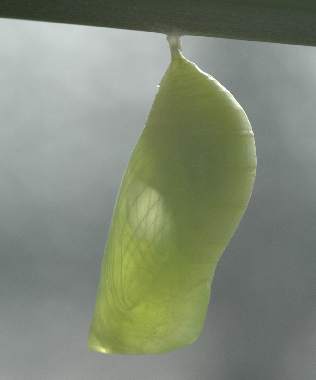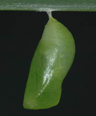 (参考) 蛹化後間もないウスイロコノマチョウの蛹 2005年8月14日 大阪府豊能町 産 大阪市淀川区 飼育 個体2:上に示した前蛹の写真撮影3時間後です。順光と逆光で撮り比べてみました。 トップページへ |