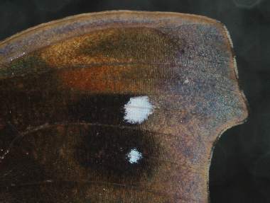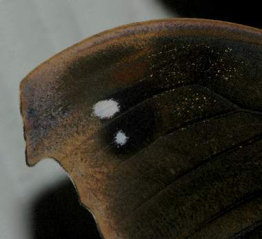 (参考) 羽化後間もないウスイロコノマチョウ(♀) 2011年12月22日 沖縄県石垣島 産 静岡市駿河区 飼育 羽化前兆の蛹を撮った夜には羽化していました。前翅表面黒紋の内側に薄茶色の模様があり、また、後翅には大きな蛇の目紋があるので、ウスイロコノマチョウであることは間違いありません。後翅裏面の蛇の目紋には紫色に光る鱗粉があります。これによって、このページの最初に示している大阪府の個体も終齢幼虫の頭部がぴったり一致するのでウスイロコノマチョウと断定できました。 トップページへ |