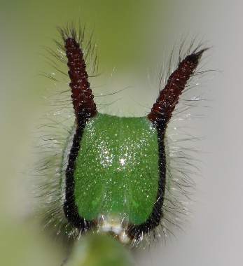 (参考) 脱皮後間もない幼虫(4齢、16.5mm)と顔の模様 2011年11月30日 沖縄県石垣島 産 静岡市駿河区 飼育 脱皮して、頭部は終齢(5齢)に近づきました。しかし、個体差も大きいようです。頭部突起はまだ黒色です。 トップページへ |