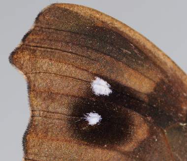 (参考) 羽化後間もないウスイロコノマチョウ 2005年8月25日 大阪府豊能町 産 大阪市淀川区 飼育 個体2:羽化しました。前翅表の黒紋の内側に赤い部分が無いので、クロコノマチョウと思っていましたが、ウスイロコノマチョウにもこういう個体がいるのでしょう。上から2つ目の白い紋が、黒紋の少し内側寄りなのがウスイロらしい気もします。また裏面にはっきりした蛇の目紋が連なっているのもウスイロらしいでしょう。 トップページへ |