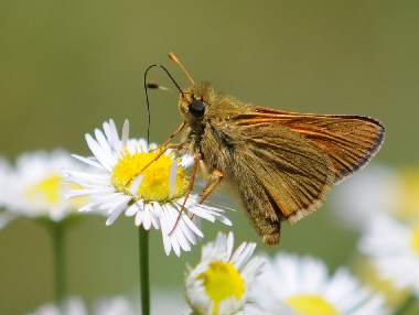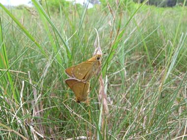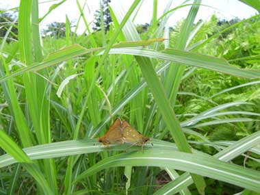 | アカセセリは、赤いセセリという意味なのでしょうが、アカシジミなどと比べるとそれほど赤くはありません。日本語のアカは、赤犬(One Pieceは関係ありません。本物のイヌです)というときと同じで、必ずしもイチゴや日の丸のような色をイメージするわけではないということなのかもしれません。赤犬は茶褐色、アカシジミもオレンジ色です。混棲することが多くまた模様が似ているコキマダラセセリ♂よりも少し赤っぽい感じがします。さて、アカセセリは僕にとっては長く憧れの蝶でした。ネット友のM氏に教えてもらい信州の高原で何とか1匹を撮ったのが最初です。そして、2013年には全く別の場所で、適当に歩いていた信州の高原で不意にかなりの数をまとめてみることができました。ここは食草のヒカゲスゲが一面に生え、近くのヒヨドリバナやヒメジオンで吸蜜したり求愛したり、ヒカゲスゲで産卵する何匹もの母蝶を観察できました。このページでは主にそのときの様子をまとめます。ここには鹿の糞が多く、もしかしたらヒカゲスゲは鹿がきらいで食べ残したおかげで、アカセセリが増えたのかもしれません。なお、下に示す長野県のアカセセリが産卵したスゲの葉は非常に細くてアカセセリの卵直径の半分程度で、“ホソバヒカゲスゲ?”と記述しておきます。また、2015年に静岡市駿河区大谷で採取し2016年春に飼育に使うスゲはヒカゲスゲとしました。 |