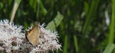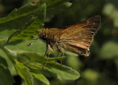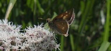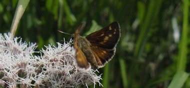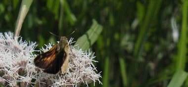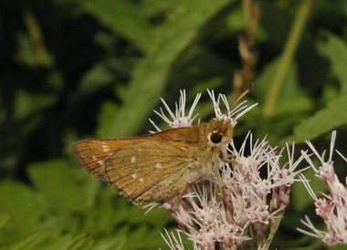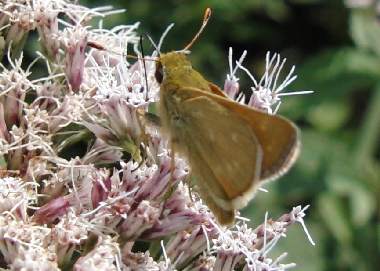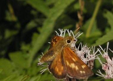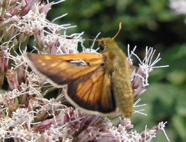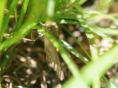 (参考) 吸蜜、新鮮な♂と♀ 2013年8月11日 長野県の高原 既に最盛期は過ぎていて後で示すように産卵も多かったのですが、わずかに比較的新鮮な♂も見られました。ヒメジオンやヒヨドリバナで吸蜜するのがよく見られました。周りには食草ヒカゲスゲが広がっていました。後翅裏面の模様が、似ている蝶のコキマダラセセリと区別ポイントですが、アカセセリでも個体によって随分と違います。 トップページへ |