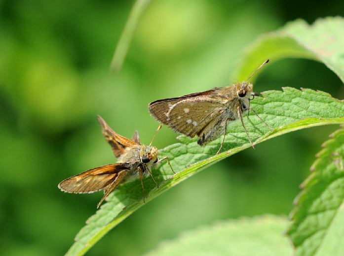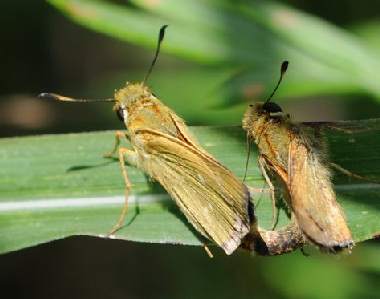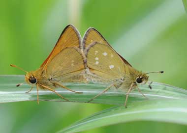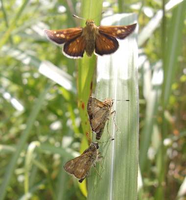 (参考) アカセセリの求愛行動 2013年8月11日 長野県の高原 ♀を見つけた♂は、後から近づいて、尾端を曲げて交尾を迫ります。この日は何度も求愛が見られましたが、一度も成立しませんでした。断る場合、♀は翅を震わせていました。 トップページへ |