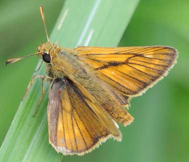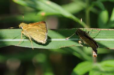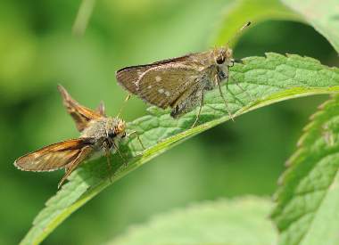 (参考) アカセセリ♂とコキマダラセセリ♂の比較 2014年7月21日 長野県の高原 両者はよく似ていますが、パッと見はかなり違い、コキマダラセセリは翅をよく開きますが、少なくともこの日は、アカセセリはほとんど開いてくれず、これが唯一の開いたシーンでした。コキマダラセセリ♂表は明るい黄色というイメージが強く、アカセセリ♂表はそれに比べると暗い感じです。また、性標に白い線があるのが特徴です。翅の形状も、アカセセリでは前縁がより曲線的です。さらには、ヒメキマダラセセリに比べると体長が明らかに大きいです。 トップページへ |