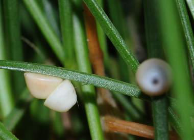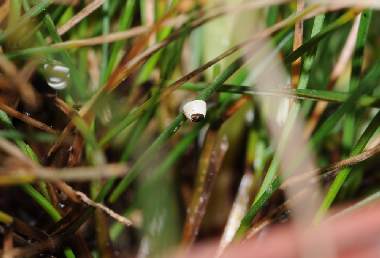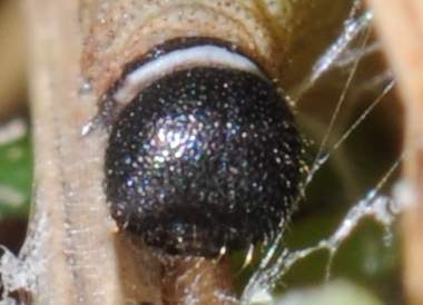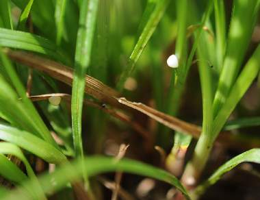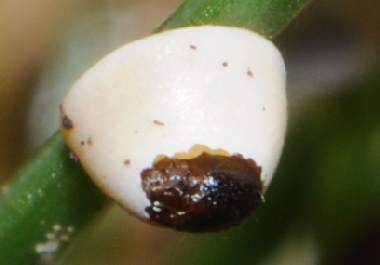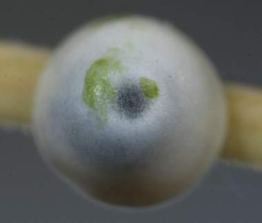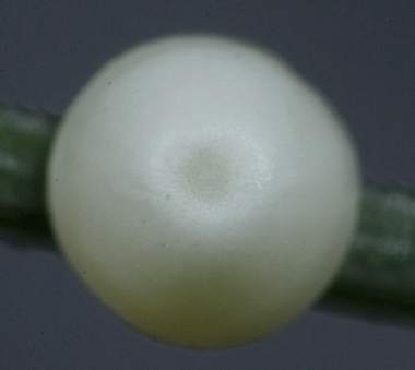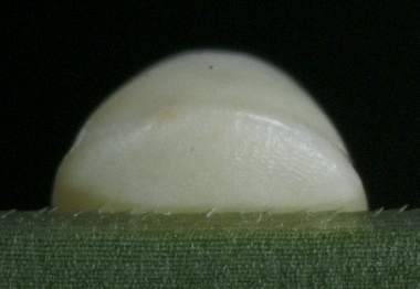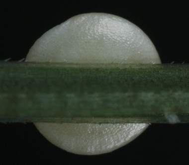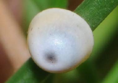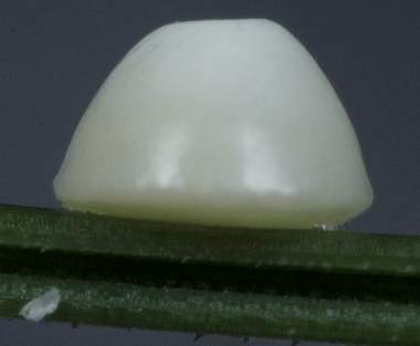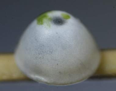 (参考) アカセセリの卵(直径1.3mm、高さ0.9mm、ホソバヒカゲスゲ?) 2013年8月11日(下2枚は12日) 長野県の高原 卵の直径よりも細いものに産卵するのは珍しいと思い、裏側からも撮影してみました。形も、多くのセセリの半球状の卵とは異なり、プリン型ともいわれるユニークなものです。 トップページへ |