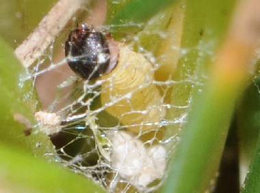 (参考) 蛹化直後のアカセセリの蛹 2016年6月1日 撮影 長野県の高原 母蝶採集 静岡市駿河区 飼育 容器の下から見ると様子が違うので蛹化したようです。そっと巣を持ち上げてみると緑色の蛹の頭部が見えました。蛹化後間もないと思います。室内のみの飼育ですが、孵化から蛹化まで2ヶ月以上かかりました。卵越冬する多くのゼフィルスに比べると2倍以上かかったことになります。 トップページへ |