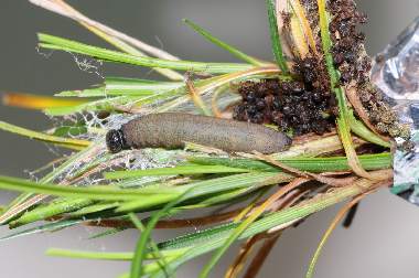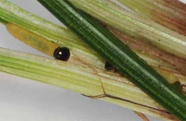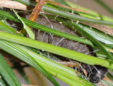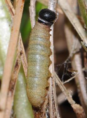(参考) 営巣中の幼虫(2齢、5.3mm、ホソバヒカゲスゲ?) 2013年9月23日 撮影 長野県の高原 採卵 静岡市駿河区 飼育 いつのまにか2齢になりました。頭は黒いままですが、体は少し褐色を帯びたように思います。体型はお尻側が太いずんぐり型で、他の茶色系セセリ類とは雰囲気が異なります。ホソバヒカゲスゲの根本近くに巣を作っています。幼虫の全容が観察できないので、いったん巣を壊して撮影させてもらいました。 トップページへ |