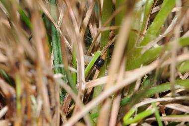 (参考) 巣から出て歩く幼虫(1齢、4.5mm、ホソバヒカゲスゲ?) 2013年9月16日 撮影 長野県の高原 採卵 静岡市駿河区 飼育 いつも探さないと見つからない幼虫が、葉上をうろうろ歩いていました。最後は巣に戻りました。 トップページへ |