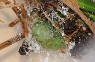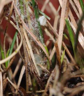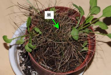 (参考) 巣中の幼虫(1齢、ホソバヒカゲスゲ?) 2013年9月8日 撮影 長野県の高原 採卵 静岡市駿河区 飼育 ベランダのホソバヒカゲスゲの株には5個以上の卵が付いていて、1つは既に孵化して部屋で飼っています。もう一つも孵化して、幼虫を探したところ、双子葉植物の草の根元近くで、ヒカゲスゲの葉を少し使いながら巣を作っていました。非常に粗いながらも網目になっていて繭のように見えます。ベランダでは、チャマダラセセリを飼ったキジムシロやコキマダラセセリを飼っているススキなどと一緒にタライに入れています。 トップページへ |
