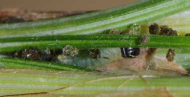 (参考) 脱皮後少し成長したアカセセリの幼虫と巣(2齢、ヒカゲスゲ) 2016年4月20日 撮影 長野県の高原 母蝶採集 静岡市駿河区 飼育 さらに成長した時の様子です。糞がどんどんたまってきます。 トップページへ |