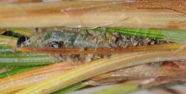 (参考) 飼育の様子と脱皮後少し成長したアカセセリの幼虫と巣(5齢、ヒカゲスゲ) 2016年5月22日 撮影 長野県の高原 母蝶採集 静岡市駿河区 飼育 密閉容器にヒカゲスゲの束を入れて飼っていますが、こうしておけばヒカゲスゲは非常に長持ちします。それでも次第に枯れてくるとカビも生えてきますが、少々であれば幼虫は気にせずそのまま潜んでいます。新たな束を入れて、新しく巣を作った状態の写真です。見づらいですが、幼虫の腹部に白い模様ができました。 トップページへ |
