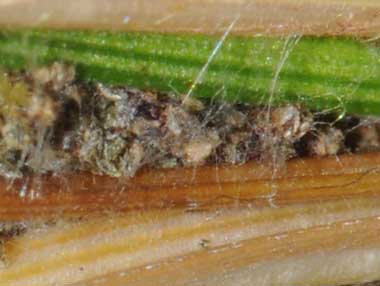 (参考) アカセセリの幼虫と巣(1齢、4mm?、ヒカゲスゲ) 2016年4月10日 撮影 長野県の高原 母蝶採集 静岡市駿河区 飼育 駿河区大谷でみつけたヒカゲスゲらしきスゲで飼育していますが、今のところ順調に育っているようです。ヒカゲスゲの小株塊をベランダで鉢植えにして育て、そこから小さい株を切り取って小さいタッパーで育てています。幼虫は根元近くで糸を吐き、さらに葉の小片や糞を付けて簡単な巣を作って潜んでいます。 トップページへ |