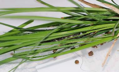 (参考) アカセセリの産卵と卵(ホソバヒカゲスゲ?) 2013年8月11日 長野県の高原 吸蜜や求愛が見られたところのそばはヒカゲスゲ群落になっていました。そこで待っていると、期待どおりアカセセリ♀がやってきて、低いところをゆっくり飛び、ヒカゲスゲの近くの地面にとまります。歩いてヒカゲスゲの中に少し潜り込んでから、尾部を曲げて1卵だけ産卵し、終わると猛スピードで飛び去りました。すぐに潜り込んでしまうので、まともな写真が撮れませんでした。ヒカゲスゲを見ると、すでに10卵以上付いていて、中には黒く幼虫ができあがっているものがありました。また、鹿の糞と思われるものが周りにいっぱい落ちていました。なお、ネット情報によると、ヒカゲスゲの葉幅は1.5〜3mmとなっており、一方、ホソバヒカゲスゲは0.3〜1.8mmとなっています。アカセセリの卵が付いた葉は、卵の半分程度なので、0.6mmぐらいですから、ホソバヒカゲスゲの可能性が高いです。そうであればアカセセリの食草としてはどちらでもよいということでしょう。 トップページへ |