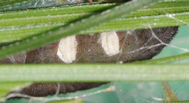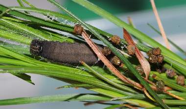 (参考) 飼育の様子と脱皮後少し成長したアカセセリの幼虫と巣(5齢、24.5mm、ヒカゲスゲ) 2016年5月25日 撮影 長野県の高原 母蝶採集 静岡市駿河区 飼育 また新たなヒカゲスゲの束に巣が移りました。古い巣の上部の内側にはやはり密に糸が吐かれています。体色はほぼ一様に黒褐色ですが、よく見るとより黒い筋が真ん中に通っています。 トップページへ |
