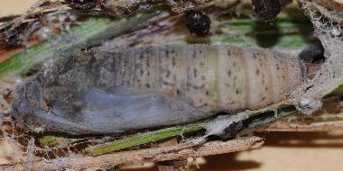 (参考) 蛹化1日後のアカセセリの巣と蛹(18.5mm) 2016年6月2日 撮影 長野県の高原 母蝶採集 静岡市駿河区 飼育 繭のある巣をひっくり返してみると、粗い繭の中の蛹が見えます。その後、繭をはがして撮影しました。黒い小さな斑点がちりばめられた模様です。 トップページへ |