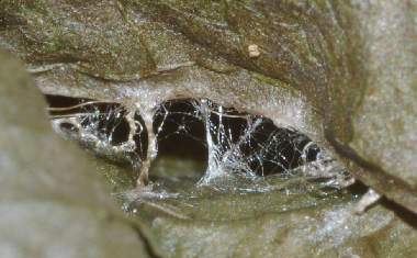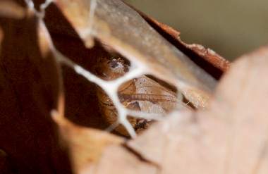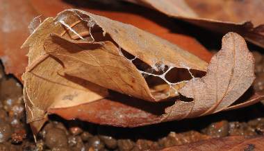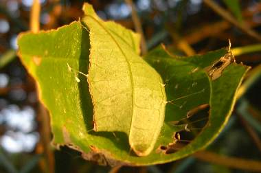 2010年11月28日 静岡市駿河区大谷 個体1:その後、中の幼虫は全く見えないようになりました。少し葉を葉がしてみると、中は完全に糸で部屋ができていました。こうなると繭と言ってもいいと思います。繭の壁を少し壊してみると、幼虫の頭部が見えました。 トップページへ |
