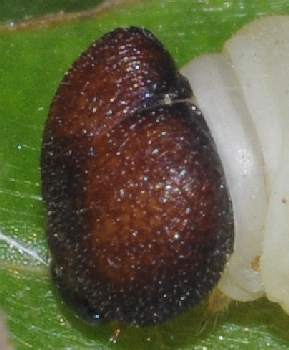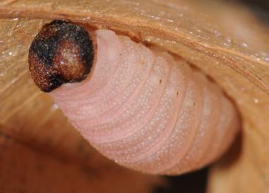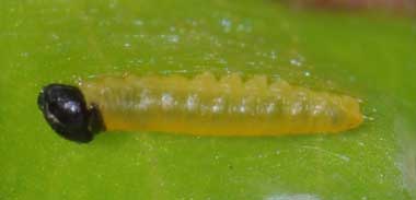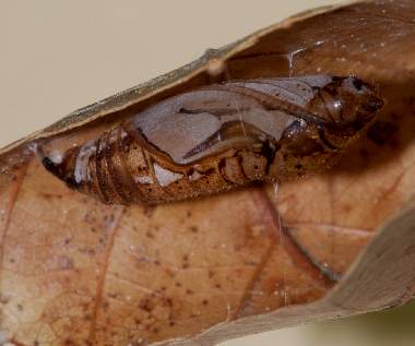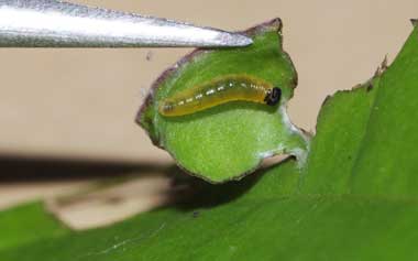 2010年11月7日 静岡市駿河区大谷 個体1の幼虫です。綴っている糸を切って中の幼虫を観察しました。摂食中の幼虫とは明らかに異なり透明感があります。 トップページへ |