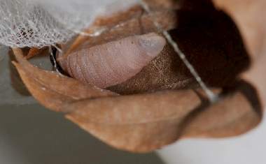 蛹巣と幼虫 2011年3月12日 伊豆箱根地方 産 静岡市駿河区 飼育 撮影のためにいじったせいか、新たに巣を作りました。おかげで頭部を撮影できました。体色もきれいなピンクだというのがよく分かります。 トップページへ |