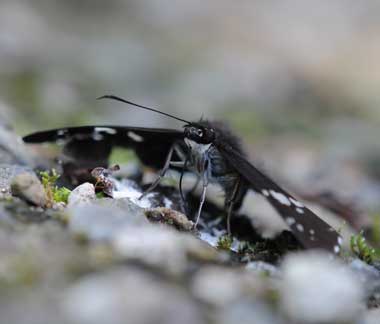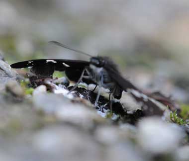 2015年7月12日 静岡市葵区 少し湿っている地面で吸水する蝶をよく見る砂利道です。歩いていると新鮮なダイミョウセセリが飛びましたが、また寄ってきました。どうやら鳥の糞を吸い戻ししているようです。ダイミョウセセリは翅を開くので尾部の様子が分かりにくいですが、覗き込んで観察すると時々尾端を曲げています。おそらく曲げたときに水滴を出して糞を溶かしているのでしょう。口吻は尾端の方に伸ばしているのも分かります。 トップページへ |