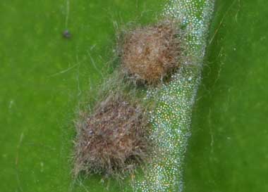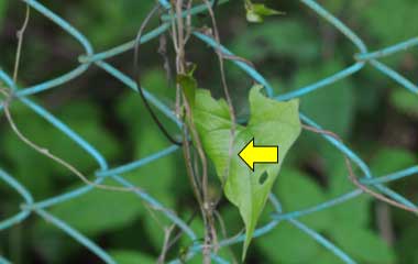 2010年5月29日 静岡市駿河区大谷 一日中影になるところに生えているヤマノイモ類の葉に、卵と幼虫が見つかりました。ダイミョウセセリの卵は母蝶の毛で守られています。 トップページへ |