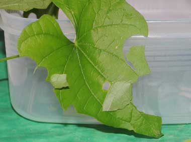 2009年10月8日 静岡市駿河区大谷 採幼 静岡市駿河区 飼育 巣の葉はほとんど枯れています。この巣は飼育開始時から使っているものです。頭部が巣の隙間から見えます。葉を全く食べなくなりました。 トップページへ |