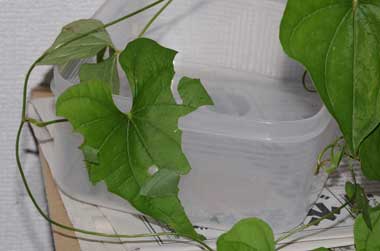 越冬巣と幼虫(4齢?) 2010年10月21日 伊豆箱根地方 産 静岡市駿河区 飼育 ヤマノイモ類の鉢植えを作り、採ってきた巣のある葉をくくりつけておいたところ、1週間以上経ってから新たに巣を作りました。ベランダに置いています。 トップページへ |
