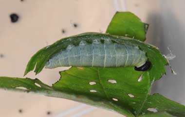 越冬巣と幼虫(5齢?) 2010年11月14日 伊豆箱根地方 産 静岡市駿河区 飼育 葉の60%程度を食べ、もう1本用意しなければならないか、と思っていたところ、新たな巣を作りました。 トップページへ |
