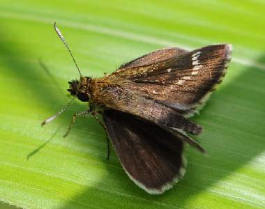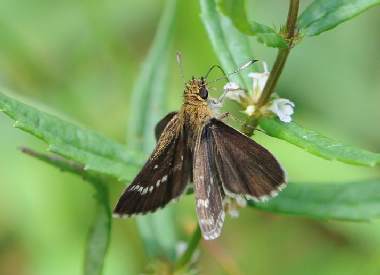 (参考) 曇天時のホシチャバネセセリの静止(♀) 2012年8月4日 山梨県(富士山麓) 太陽が雲に隠れると、セセリチョウ特有の半開状態になり表面がはっきり見えます。前翅表に孤立した白い紋は♀では明瞭に見られます。 トップページへ |