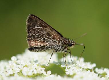 | ホシチャバネセセリは、日本では本州と、そこから離れて対馬にのみ生育し、本州ではいわゆる高原の蝶です。いるところにはいる、と言うことですが、かなり生育地は限られ、他の高原の蝶と同様に数はどんどん減っているようで、私はずっと見たことが無く、前翅表の独特の“星模様”も気に入っていて憧れの蝶の1種でした。もっとも、出現期がまさに盛夏で、この時期に(アルプスに登ることが多く)高原にあまり行かないということもあります。本州の生育地においては、中部各アルプスや富士山周辺では比較的安定に見られるそうですが、中国山地では減少しているといわれています。小さくて黒っぽい蝶でしかも俊敏の飛ぶため、なかなか見つけづらく、飛ぶとすぐに見失うそうです。私は、2012年8月に富士山麓で初めて観察することができました。ここは他の蝶も含めてかなり有名産地ですが、広大な高原なので、採集圧でいなくなることは無さそうです。現地でお会いした各位(特にトンボメインの方)に感謝致します。卵や幼虫はずいぶん探したのですが、全く成功しません。ある方から越冬中の幼虫を入手して育ててみました。 |