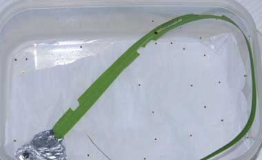 (参考) ホシチャバネセセリの越冬巣と幼虫頭部 2017年1月31日 撮影 長野県 産 静岡市駿河区 飼育 入手した幼虫とその巣です。3匹入手しました。ティッシュペーパーを敷いた小さい密閉容器に巣を入れ、これを少し大きい密閉容器に入れ、乾かないように水を入れて冷蔵庫に入れました。 トップページへ |