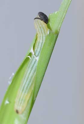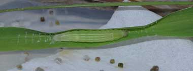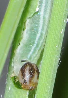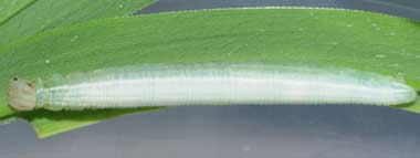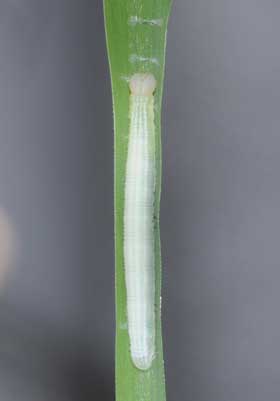 (参考) 脱皮後成長したホシチャバネセセリの幼虫と食痕(5齢?、25.8mm、ススキ) 2017年5月6日 撮影 長野県 産 静岡市駿河区 飼育 個体1:脱皮して頭部がほぼ白くなりました。白い頭部をもつセセリは珍しいです。飼育しているということもあるのでしょうが、あまり明確な巣を作りません。 トップページへ |