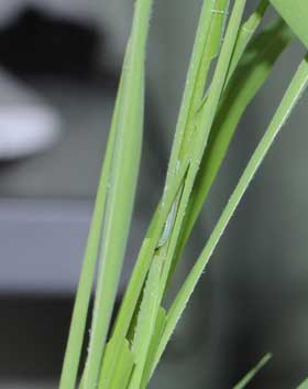 (参考) 摂食中のホシチャバネセセリの幼虫(4齢?、13.3mm、ススキ) 2017年5月6日 撮影 長野県 産 静岡市駿河区 飼育 個体3:鉢植えのススキで飼っている個体3では、巣をしっかり作っています。ときおり巣の上や下の葉を食べていました。 トップページへ |