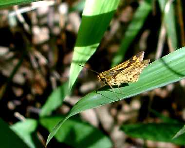 | キマダラセセリは大阪市周辺では、非常に稀な蝶です。“メッシュマップ大阪市の生き物”によれば、大阪市内では、大和川と鶴見緑地で見つかっているそうです。豊中市の服部緑地でも継続して観察されており、私もついに2003年6月29日、ササ上に静止しているのを撮影できました。2004年10月には1度に3匹見たり、ここではけっこう多いかもしれません。その後、摂津市の淀川河川敷や尼崎市の藻川でも見ました。ホームページ雑記帳(リンクページ参照)によれば、堺市でもかなり珍しいようです。2005年7月、雑木林のササに3齢?幼虫が見つかり、飼育して羽化させました。 |
