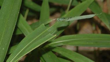 休息 2003年6月29日 大阪府豊中市服部緑地公園 雑木林の中です。どこからともなくやってきてササの葉上に静止しました。少しすれているようで、少し前に羽化したようです。この日はこの個体のみ観察できました。 トップページへ |