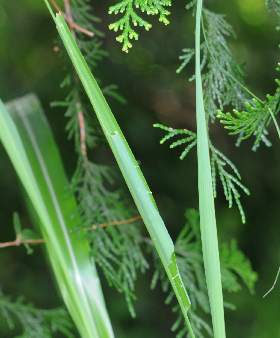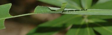 幼虫の巣(ササ)と幼虫(4齢?、20mm) 2005年7月24日 大阪府豊中市服部緑地公園 雑木林の林床のササにセセリチョウの巣が見つかりました。少し巣を開いて幼虫を撮影しました。 トップページへ |