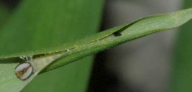 2007年8月26日 大阪府豊中市服部緑地公園 雑木林下のササ原にセセリの巣があり、少しあけて中を見ると、寄生バエの囲蛹と幼虫の死骸がありました。同時期新鮮な成虫も見られました。 トップページへ |