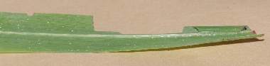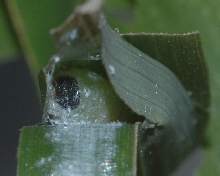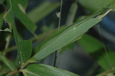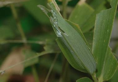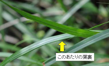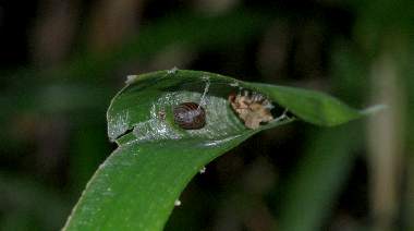 2004年7月3日 大阪府豊中市服部緑地公園 雑木林の中です。ササの葉上の液体を吸っていました。これ以外の個体は見ませんでした。 トップページへ |
