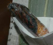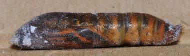 2005年8月9日 大阪府豊中市服部緑地公園産 大阪市淀川区飼育 巣の中に残っていた蛹化時の脱皮殻です。左が頭、右が尾部です。尾部の黒い板が特徴的です。 トップページへ |