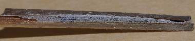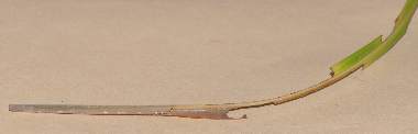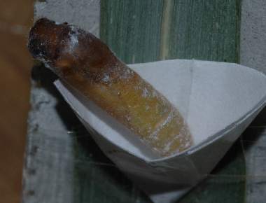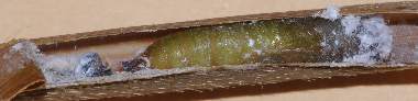 2005年8月9日 大阪府豊中市服部緑地公園産 大阪市淀川区飼育 巣の中が真っ白になるぐらい糸が吐かれていました。これはイチモンジセセリの蛹の巣と同様です。予想どおり、中を開けると蛹化していました。葉の基部側が蛹の尾部側です。 トップページへ |