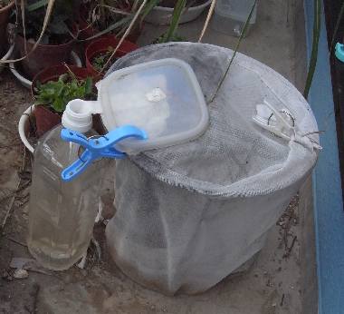 2012年10月2日 撮影 静岡市駿河区 飼育 静岡市駿河区大谷 母蝶採集 いつもの採卵風景です。900mLペットボトルにほのかに甘い砂糖水を入れ、ティッシュペーパーで吸水させて、網の天井部分が常に濡れた状態になるようにしています。鉢植えの小さなススキ類(これはすでにいろんなセセリの採卵に使ったもの)を入れています。母蝶は2匹いれましたが、1匹しか写っていません。 トップページへ |