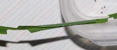 2013年3月19、20日撮影 静岡市駿河区 飼育 静岡市駿河区大谷 母蝶採集 個体1:部屋内のタッパーに放置していましたが、ベランダのススキの葉も大きくなったので与えてみました。すると、古い巣に穴を開け、そこから体の一部を出して葉を食べていました。タッパー越しなので食べている様子は撮れていません。その後、古い巣から出てしばらくは巣を作らず新しい葉を食べていました。 トップページへ |