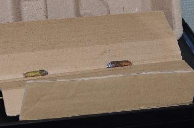 2013年5月11-12日撮影 静岡市駿河区 飼育 静岡市駿河区大谷 母蝶採集 個体1:蛹は時々動き、勝手に枯れたススキの葉から出てしまったので、曲げた段ボールの谷の部分に置きました。そしてこの段ボールは、羽化して羽が伸ばせるように別の段ボールにくっつけて置いています。蛹は次第に黒っぽくなり、翅の模様が明瞭になりました。 トップページへ |