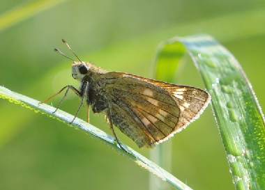 (参考) 静止(♀) 2013年6月29日 山梨県の高原 ♀では黒い部分が多くなり、♂との区別は容易です。アカセセリと比べると、後翅裏面の紋が異なり列を成す紋だけになり、中央に離れた紋がありません。 トップページへ |