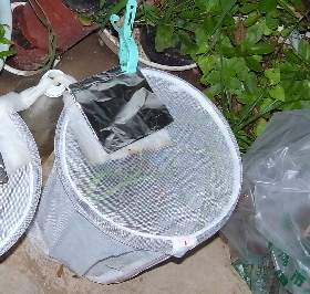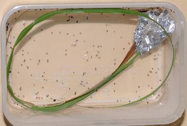(参考) 強制採卵(ススキ) 2013年8月12日 撮影 長野県の高原 母蝶採集 静岡市駿河区 飼育 いつものように百均でそろえた洗濯網などで吹き流しを作り、砂糖水(さとうきび糖)を薄めた砂糖水をペットボトルからティッシュを通して天井部分のティッシュペーパーを毛管現象で濡らしています。この日の朝にセットして母蝶を2匹入れたところ、夜見ると1匹既に死んでいましたが、もう1匹は元気で、卵も20卵ほど見つかりました。ほとんどがススキの葉裏に産んでいて、一部表に産まれていました。 トップページへ |