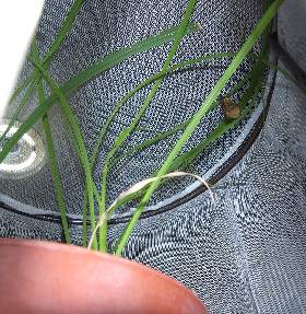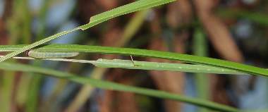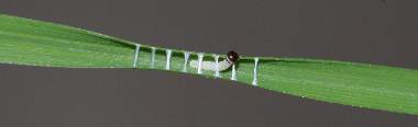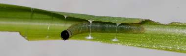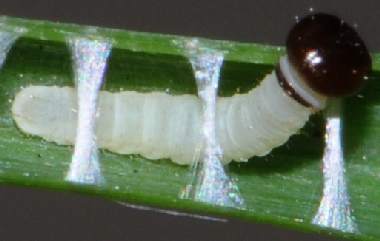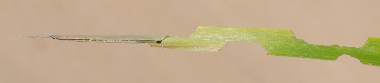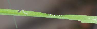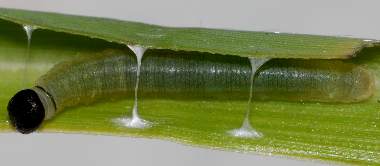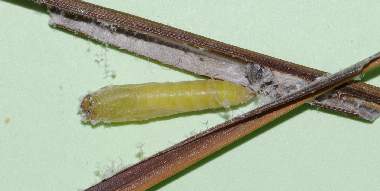 (参考) 摂食中の幼虫と巣と食痕(1齢、3.9mm、鉢植えススキ) 2013年8月20日 撮影 長野県の高原 母蝶採集 静岡市駿河区 飼育 個体3:個体2はなぜか全く葉を食べません。ほぼ同時に孵化しおなじ鉢にいる個体3は順調にススキの葉を食べています。 トップページへ |