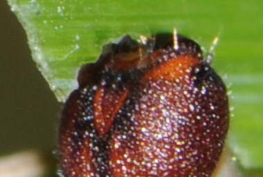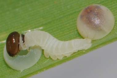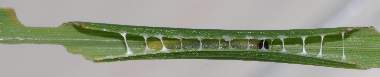 (参考) 孵化後間もない幼虫(1齢、2.7mm、鉢植えススキ) 2013年8月19日 撮影 長野県の高原 母蝶採集 静岡市駿河区 飼育 個体2:ベランダに置いている、元もと産卵に使った鉢植えのススキにも卵を数個残しています。こちらの方が孵化がわずかに早いものが多く、3匹ほどは糸を掛けて巣を作り終えようとしています。巣を作っている場所はいずれも葉表ですが、葉が垂れる部分や立ち上がる部分など様々です。 トップページへ |