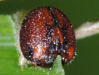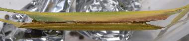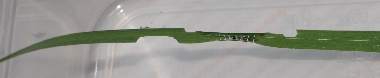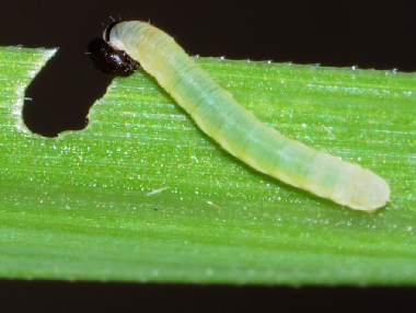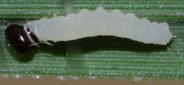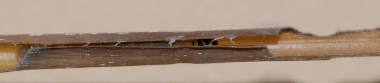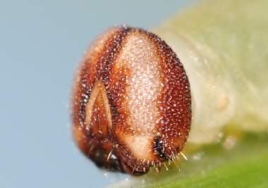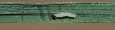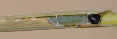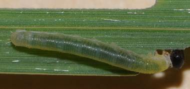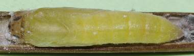(参考) 摂食中の幼虫と噛み跡と食痕(4齢、12.7mm、鉢植えススキ) 2013年9月7日 撮影 長野県の高原 母蝶採集 静岡市駿河区 飼育 個体A:鉢内で移動しているので、個体識別ができなくなりました。とりあえずAとしておきます。室内で飼っている幼虫の頭部は未だ黒いのですが、この個体では茶色と焦げ茶の模様が現れています。4齢とすれば、これまで見たことがない模様で、イチモンジセセリやチャバネセセリが勝手に産んだ幼虫ではないと思います。 トップページへ |