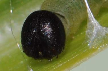 (参考) 眠に入ったコキマダラセセリの幼虫(1齢、5.2mm、ススキ) 2013年8月24日 撮影 長野県の高原 母蝶採集 静岡市駿河区 飼育 個体1:見づらいですが、次の頭ができつつあります。 トップページへ |