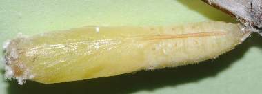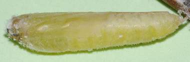 (参考) コキマダラセセリの蛹(20.0mm) 2013年10月17日撮影 長野県の高原 母蝶採集 静岡市駿河区 飼育 個体1:巣をそっと開けてみると巣にぴったり収まるように蛹化していました。頭部には幼虫時代とは異なる模様があります。なお、本来は幼虫越冬です。結局、10月27日には羽化していましたが、成虫は見つかりませんでした。羽化前兆と羽化個体は、下記の個体2を参考にしてください。 トップページへ |